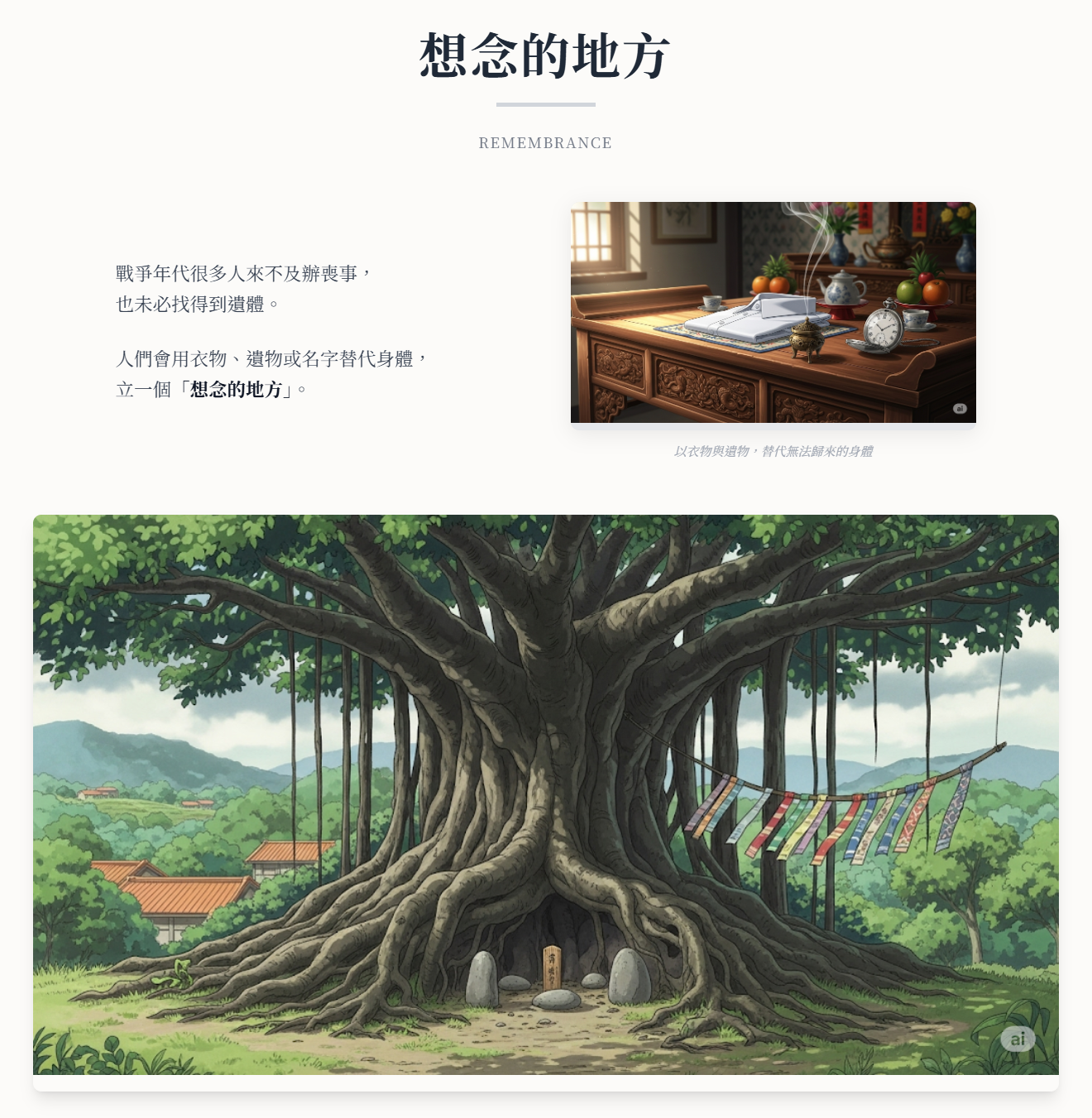 人們會用衣物、遺物或名字替代身體,立一個「想念的地方」。